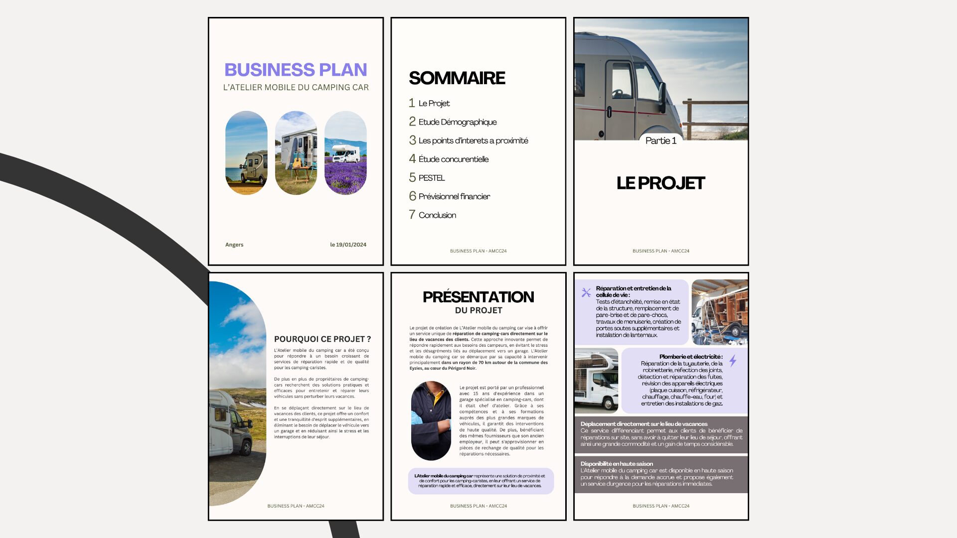 L'Atelier Mobile Camping Car lançait un concept inédit - un service de réparation et dépannage de camping-cars directement sur le lieu de vacances du client. Pour convaincre les partenaires bancaires, il fallait un Business Plan professionnel et impactant, bien loin du simple document Word.