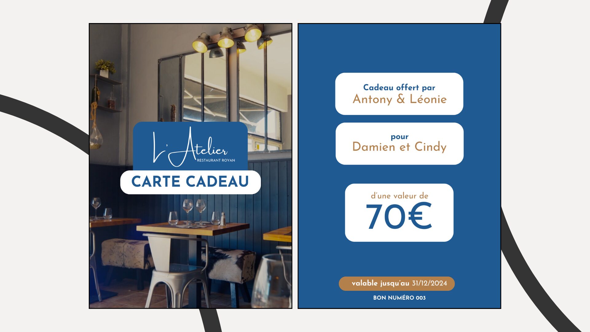 Format carte de correspondance glissée dans une enveloppe assortie, elle transforme un repas en cadeau tangible et valorisant. Les clients fidèles deviennent ainsi les premiers ambassadeurs de L'Atelier auprès de leurs proches.